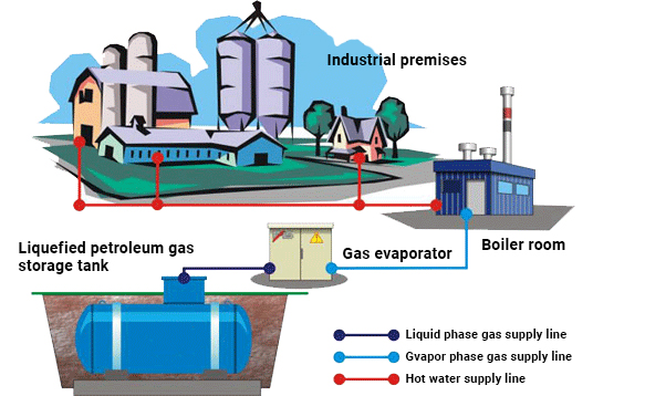 The company’s gas supply system is a complex of liquefied gas tanks, pumping and evaporative equipment. Such gasification of industrial facilities is also used when there is no main gas pipeline, that is why it is called autonomous gas supply for enterprises.